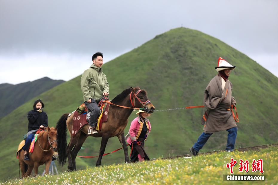 6月28日,游人騎馬走在草原上。中新社記者 王磊 攝