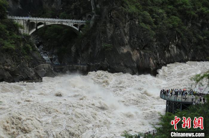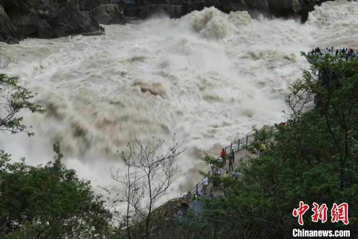 虎跳峽景區(qū)位于云南省迪慶藏族自治州香格里拉市,因猛虎躍江心石過江的傳說而得名。近日該地連續(xù)降雨,金沙江水位上漲,澎湃江水吸引游客。