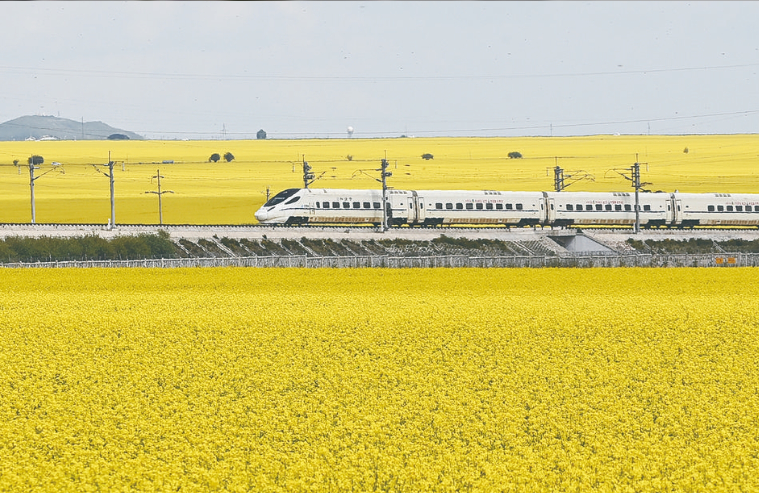 7月18日,一列動車正穿行在青海省海北藏族自治州門源回族自治縣的百里油菜花海。有“中國最美油菜花?!敝雷u的門源油菜花海已進入盛花期,7月也是最美的觀賞季。(祁國彪 攝)