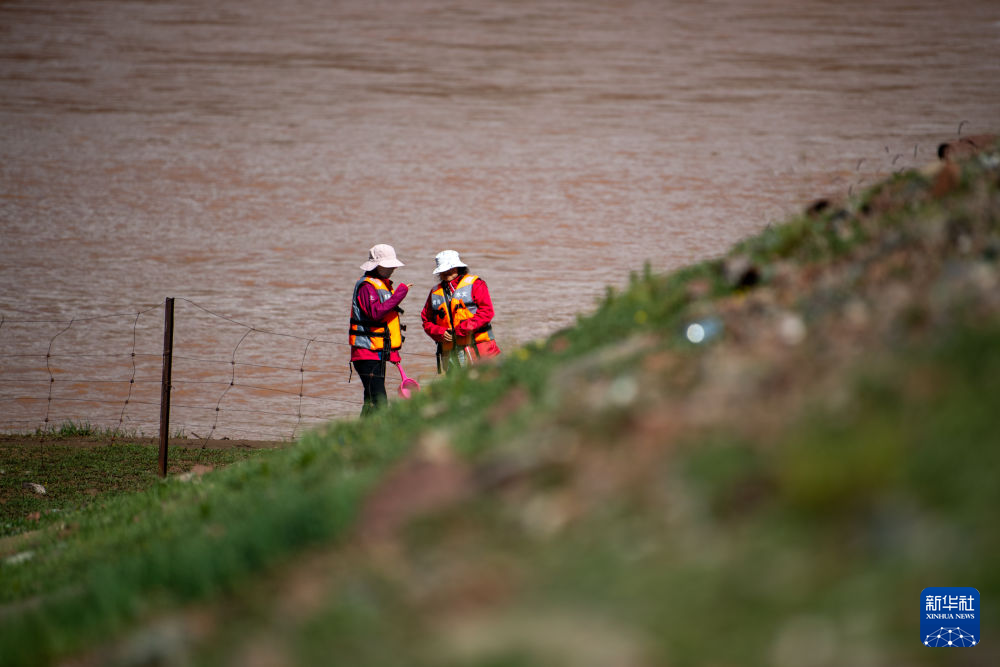 7月21日,長江科學(xué)院空間信息技術(shù)應(yīng)用研究所的付珺琳(右)和同事在扎曲第一拐江段進(jìn)行土壤多參數(shù)檢測。新華社記者 陳杰 攝