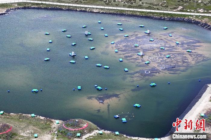 圖為高山上“拉索”一處水塘中也安裝了不少探測器。(無人機照片)中新社記者 劉忠俊 攝