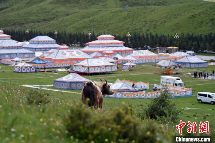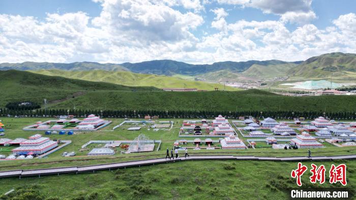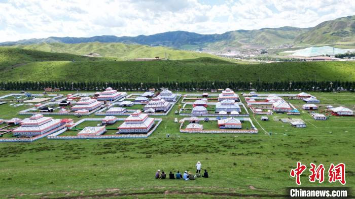 7月31日,航拍位于甘肅省甘南藏族自治州合作市的當(dāng)周草原。當(dāng)周草原風(fēng)景區(qū)內(nèi)綠草連天,高山、森林、草原和亭臺(tái)帳篷融為一體,以其涼爽的氣候和獨(dú)特的旅游資源成為游客青睞的避暑旅游勝地。圖為當(dāng)周草原風(fēng)景區(qū)的帳篷城。(無(wú)人機(jī)照片)中新社記者 九美旦增 攝