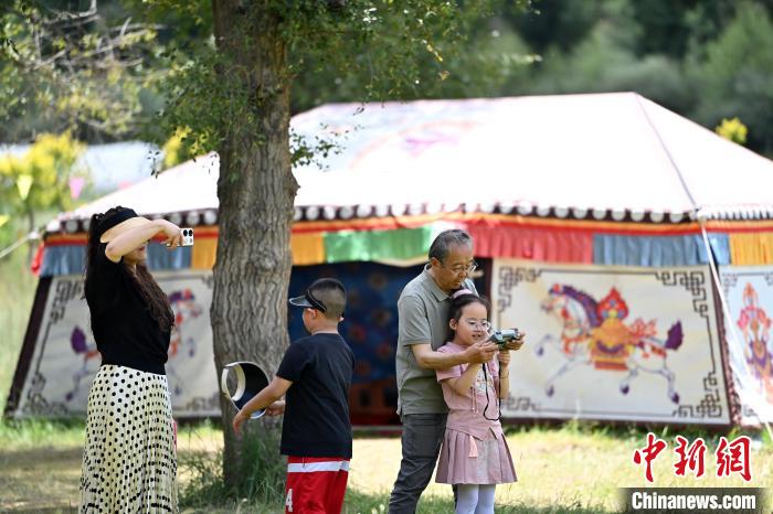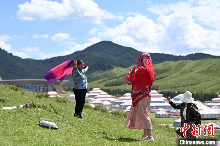 7月31日,甘肅省甘南藏族自治州合作市的當(dāng)周草原風(fēng)景如畫(huà)。當(dāng)周草原風(fēng)景區(qū)內(nèi)綠草連天,高山、森林、草原和亭臺(tái)帳篷融為一體,以其涼爽的氣候和獨(dú)特的旅游資源成為游客青睞的避暑旅游勝地。圖為游客在當(dāng)周草原拍照留影。中新社記者 九美旦增 攝