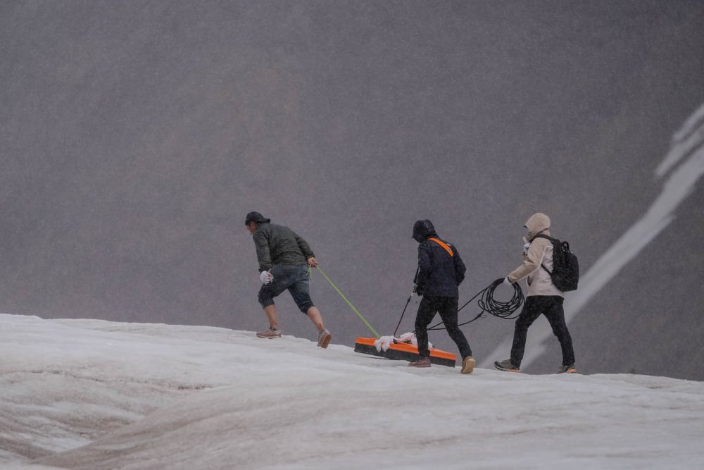 科考隊(duì)員在冬克瑪?shù)妆ㄉ鲜占瘶悠罚?024年7月25日攝)。新華社 杜笑微 攝