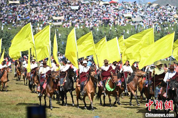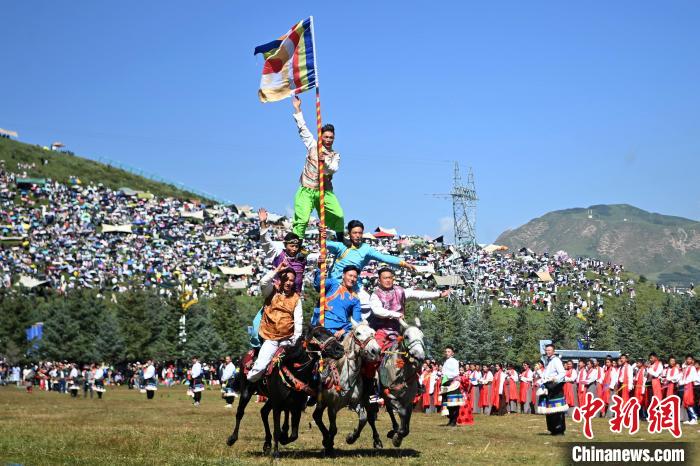 8月4日,藏族騎手在當周草原上表演馬隊巡游。中新社記者 九美旦增 攝