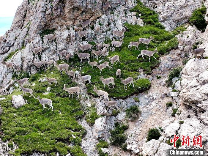 圖為成群巖羊在山坡上。才新木加 攝
