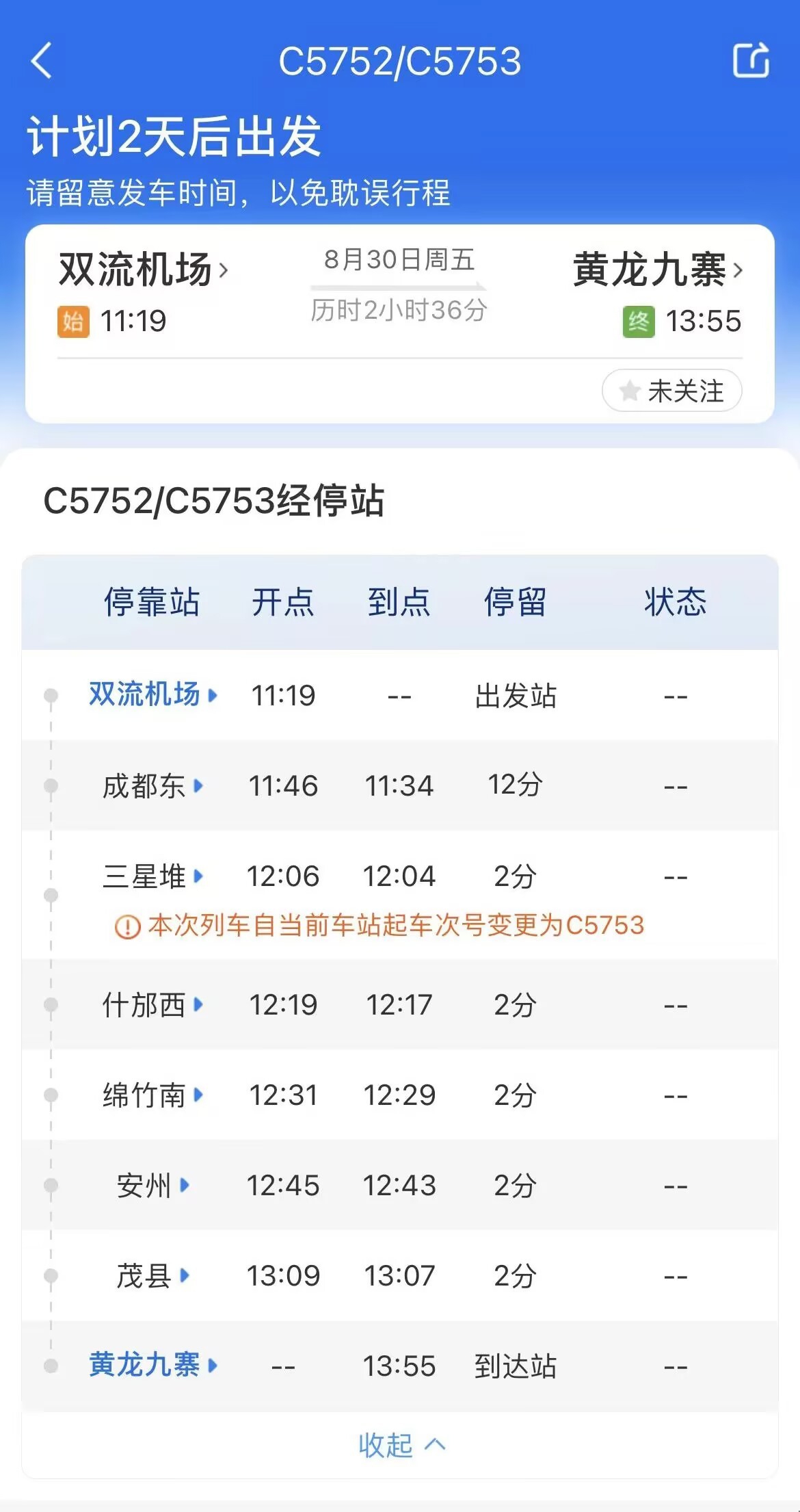 8月28日,記者從12306網(wǎng)站時(shí)刻表看到,目前四川成都至青海西寧鐵路鎮(zhèn)江關(guān)至黃勝關(guān)段車次信息已可以查詢,最近的發(fā)車時(shí)間為8月30日,成都至黃龍九寨動(dòng)車用時(shí)在兩小時(shí)左右,這也意味著成都到黃龍景區(qū)、九寨溝景區(qū)的車程將大大縮短。