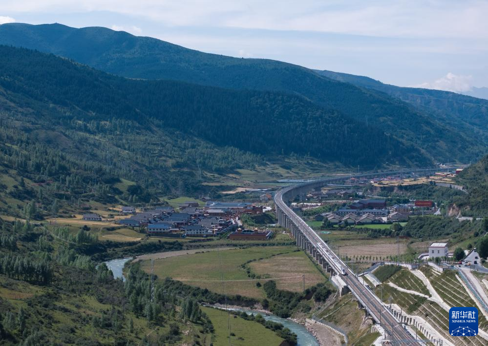 C5764次列車行進在川青鐵路黃龍九寨站至松潘站間,鐵路邊是岷江和213國道(8月30日攝,無人機照片)。新華社記者 江宏景 攝