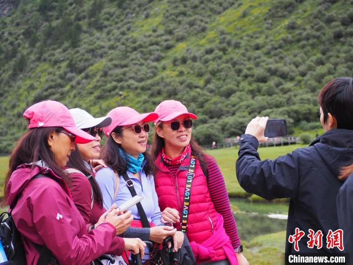 身穿沖鋒衣,腳踩徒步鞋,頭戴運動帽,四位來自臺灣的觀光客7日上午行走在四川省甘孜藏族自治州稻城亞丁景區(qū)內(nèi),她們的臉上洋溢著笑容,不時停下和遠處的央邁勇雪山合影。
