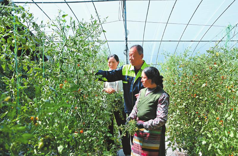 在瑪吉阿米花園農(nóng)莊的大棚內(nèi),山東壽光來的劉振國(中)在指導栽培技術。四川日報全媒體記者 肖雨楊 攝