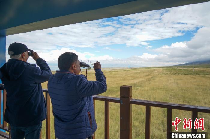 圖為尼泊爾媒體考察團(tuán)成員在青海湖國家級自然保護(hù)區(qū)南岸保護(hù)站用望遠(yuǎn)鏡觀察普氏原羚。中新社記者 馬銘言 攝