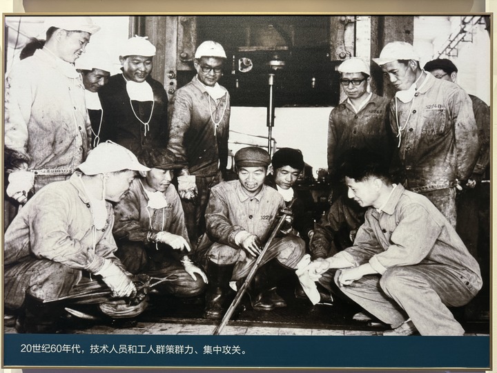 原子城紀(jì)念館展示的二二一廠技術(shù)人員和工人集中攻關(guān)的照片。新華社 潘旭 攝