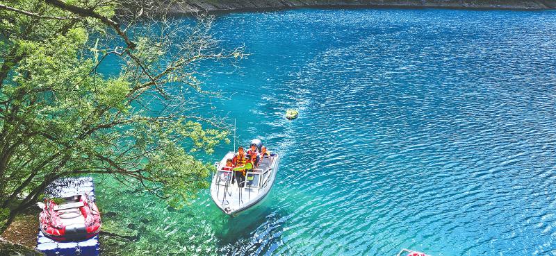 科研團隊成員乘巡邏船在九寨溝長海開展測量工作。韋維 攝