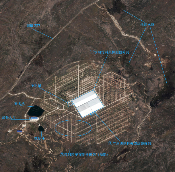 從衛(wèi)星影像示意圖上可以看到,“拉索”毗鄰國道,地勢整體平坦,優(yōu)質(zhì)水源豐富。得益于世界屋脊的高海拔優(yōu)勢和多項(xiàng)關(guān)鍵核心技術(shù)的突破,“拉索”集合了三項(xiàng)“世界之最”:最靈敏的超高能伽馬射線探測裝置,最靈敏的甚高能伽馬射線源巡天普查望遠(yuǎn)鏡,能量覆蓋范圍最寬的超高能宇宙線復(fù)合式立體測量系統(tǒng)。自2021年“拉索”完成建設(shè)投入使用以來,成績斐然。
