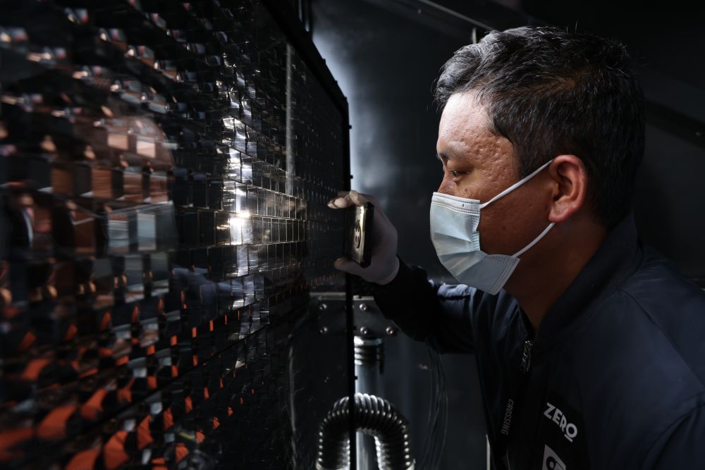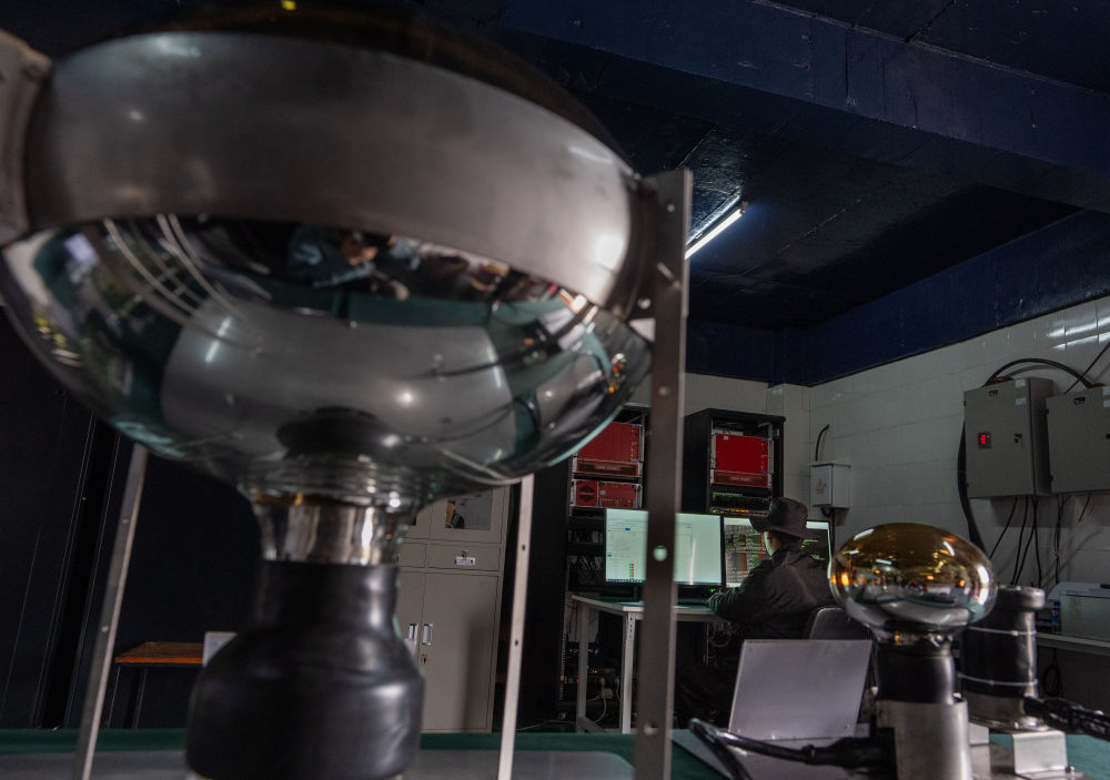 9月20日,“拉索”工作人員在一臺廣角切倫科夫望遠(yuǎn)鏡上檢查成像部件。新華社記者 金立旺 攝