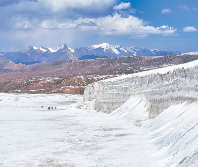 十幾公里的路,汽車走了一個小時。越接近冰川腳下,路越是泥濘,雪水拍打著車身。終于,八一冰川到了。一座巨型冰墻橫亙眼前,10多米高的冰柱懸掛在外側(cè)。陽光下,冰化成水,滴滴落下。不遠處,一條涓涓細流正往西南方向的山下流去。祁進賢說:“這里就是黑河的源頭,是管護的重中之重。每次來,我都要觀察冰川與上次相比有沒有變化?!?/p>