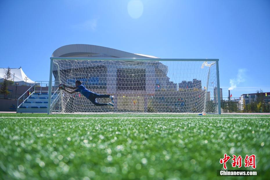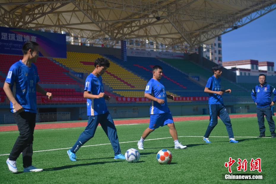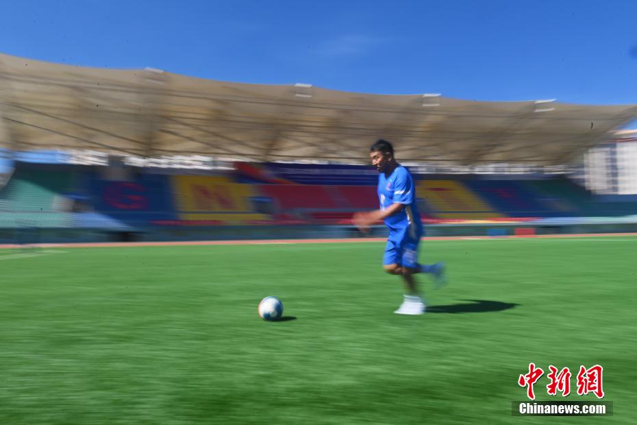 10月15日,在甘肅省甘南藏族自治州合作市一足球場內(nèi),甘南九二聯(lián)隊足球隊員進行訓練。