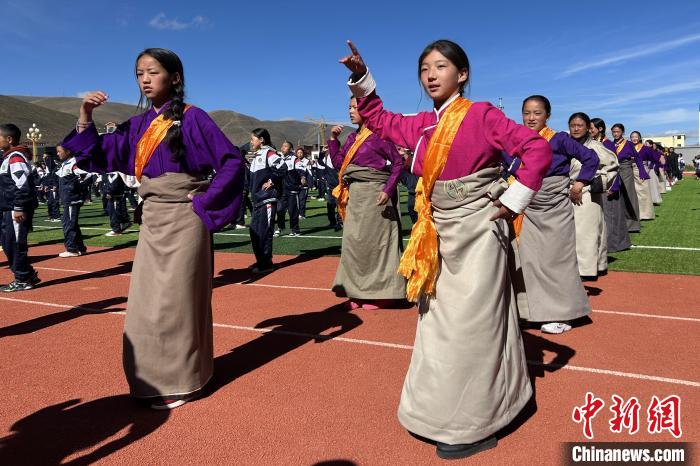 近日,色達(dá)縣中學(xué)東校區(qū),學(xué)生們在跳藏族鍋莊舞。中新社記者 王鵬 攝