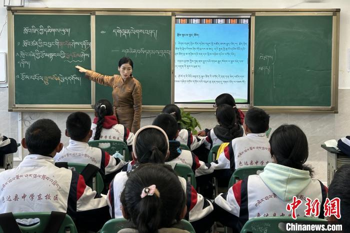 近日,色達(dá)縣中學(xué)東校區(qū),學(xué)生們在上藏文課。中新社記者 王鵬 攝