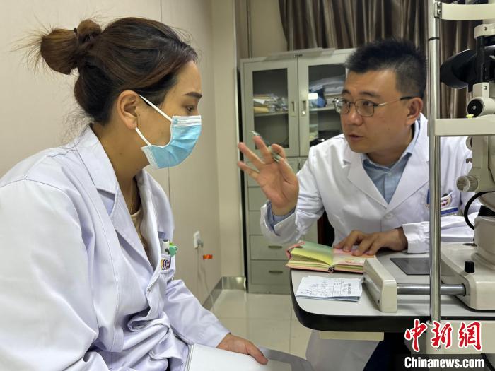 資料圖為顏繁誠(chéng)(右)與玉樹(shù)州人民醫(yī)院眼科中心醫(yī)生交流。潘雨潔 攝