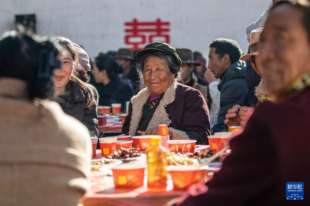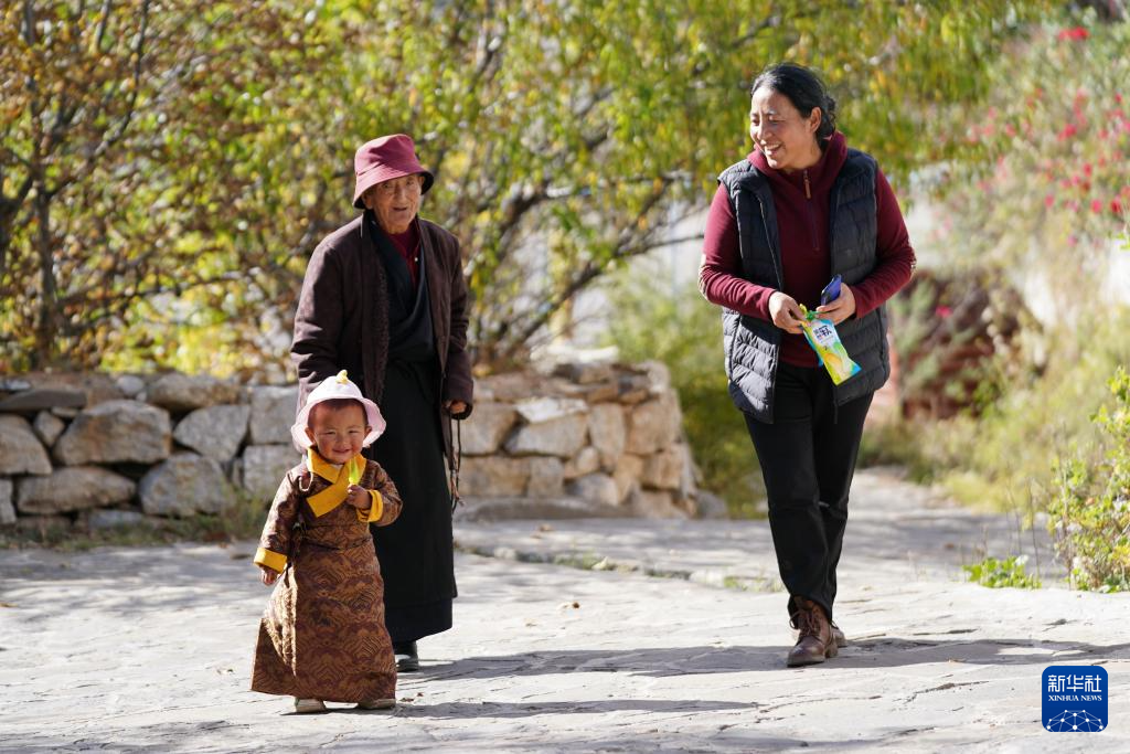 11月2日,在仲德村的一場(chǎng)婚禮上,新娘羅絨扎姆(右二)接受客人的哈達(dá)祝福。新華社記者 胥冰潔 攝