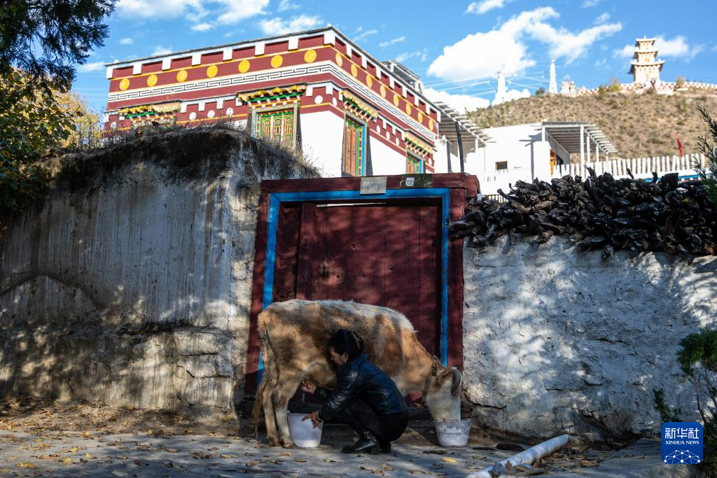 11月2日,仲德村村民四朗擁初在家門(mén)口擠牛奶。新華社記者 儲(chǔ)加音 攝