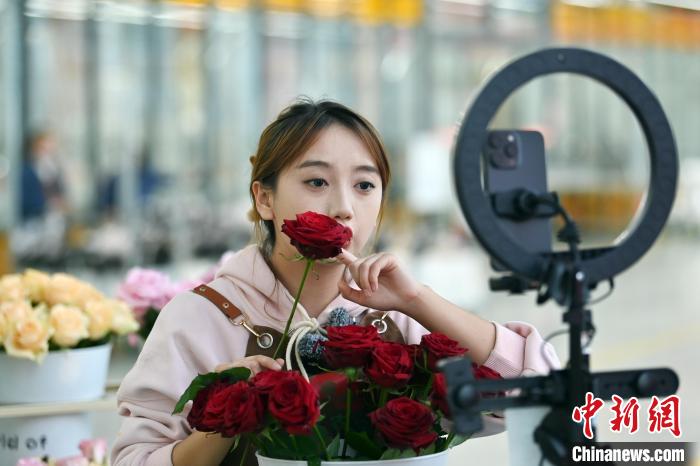 花瓣自帶絲絨感的“娜歐米”、文藝范兒十足的“紫霞仙子”、仙氣滿滿的“洛神”玫瑰……走進鮮花港內,濃郁的玫瑰花香撲鼻而來。來自甘肅甘南藏族自治州夏河縣的鮮花港工作人員南吉卓瑪正在給玫瑰花打捆包裝。