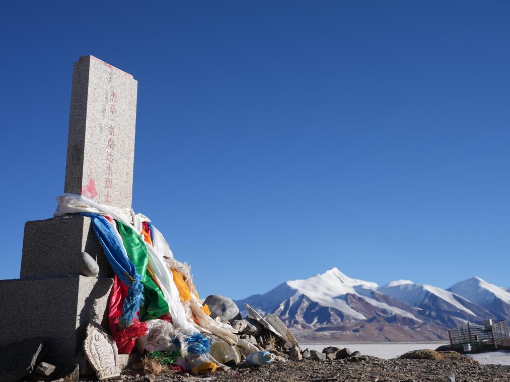 這是可可西里無人區(qū)腹地太陽湖湖邊索南達杰烈士紀(jì)念碑,索南達杰犧牲在太陽湖,他的骨灰也撒在太陽湖(攝于2025年1月14日)新華社發(fā)