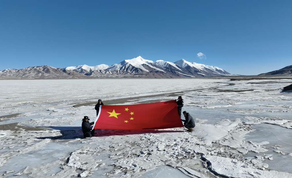 巡山隊員在可可西里無人區(qū)腹地的太陽湖湖邊,展開一面五星紅旗,這面國旗曾于2021年10月2日在天安門廣場升起。(攝于2025年1月14日)新華社發(fā)