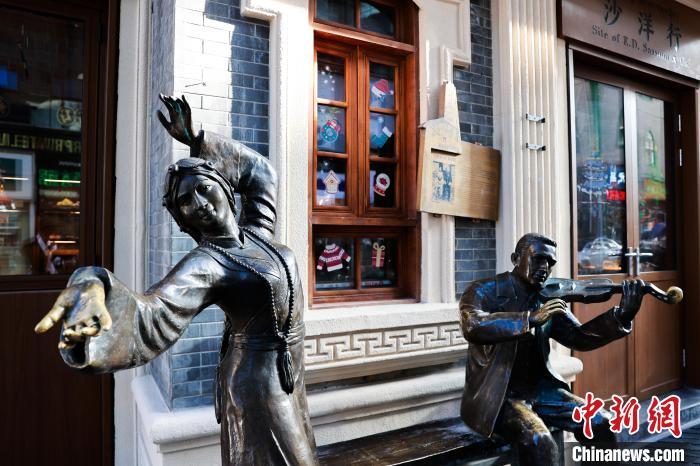 2024年12月24日,四川康定,康定情歌文化中心門(mén)口的仁欽拉姆(左)與金路易雕像。中新社記者 薛蒂 攝