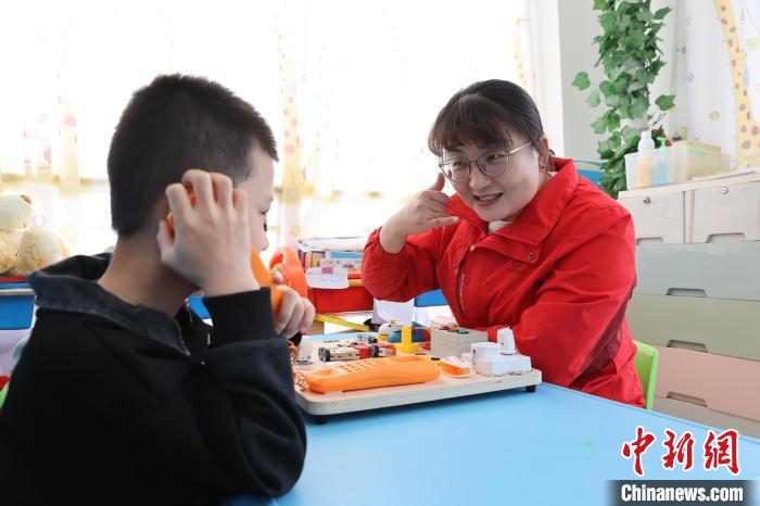 3月31日,青海西寧,特教老師黨萬紅幫助孤獨(dú)癥兒童練習(xí)日常動(dòng)作。青海省西寧市星光特殊兒童服務(wù)中心現(xiàn)有四十多名特教老師,他們用愛點(diǎn)亮“星星的孩子”內(nèi)心世界,幫助這些孩子更好地融入學(xué)校生活、走向社會。張忠蘋 攝
