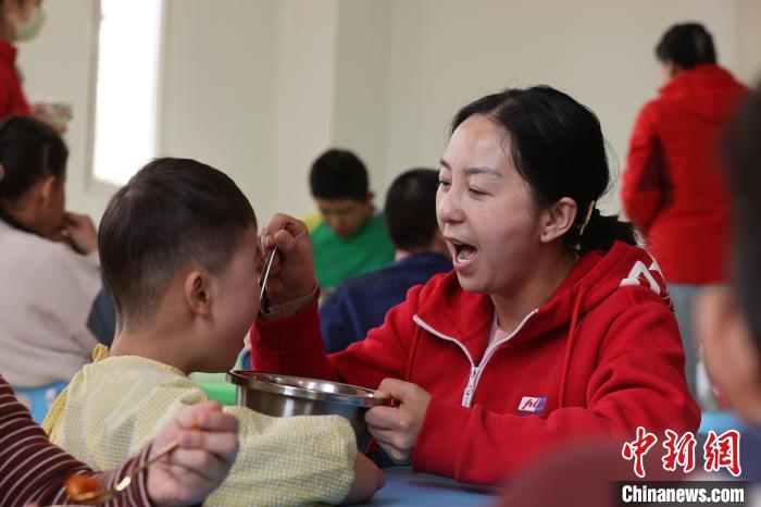 3月31日,青海西寧,特教老師侯玉芳給孤獨(dú)癥兒童喂飯。青海省西寧市星光特殊兒童服務(wù)中心現(xiàn)有四十多名特教老師,他們用愛點(diǎn)亮“星星的孩子”內(nèi)心世界,幫助這些孩子更好地融入學(xué)校生活、走向社會。張忠蘋 攝