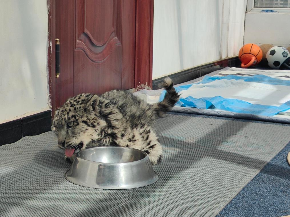 4月4日,“凌小蟄”在吃飽后舔舐飯盆。青海野生動物救護繁育中心供圖