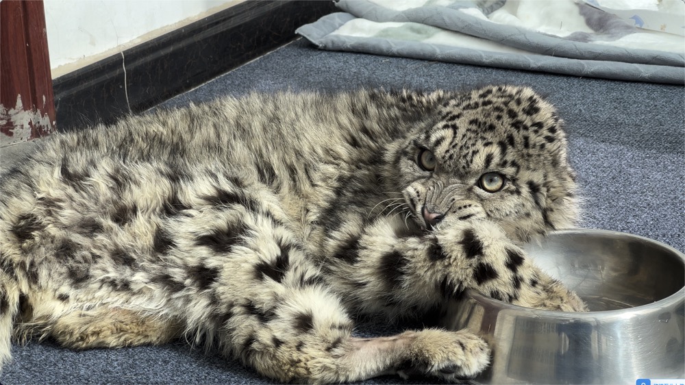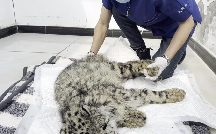 “剛送來時,小雪豹身型干枯、四肢伸得直直的、頭部向后仰著,”救護中心副主任齊新章回憶,“小小的一坨,瘦弱得讓人心疼”。