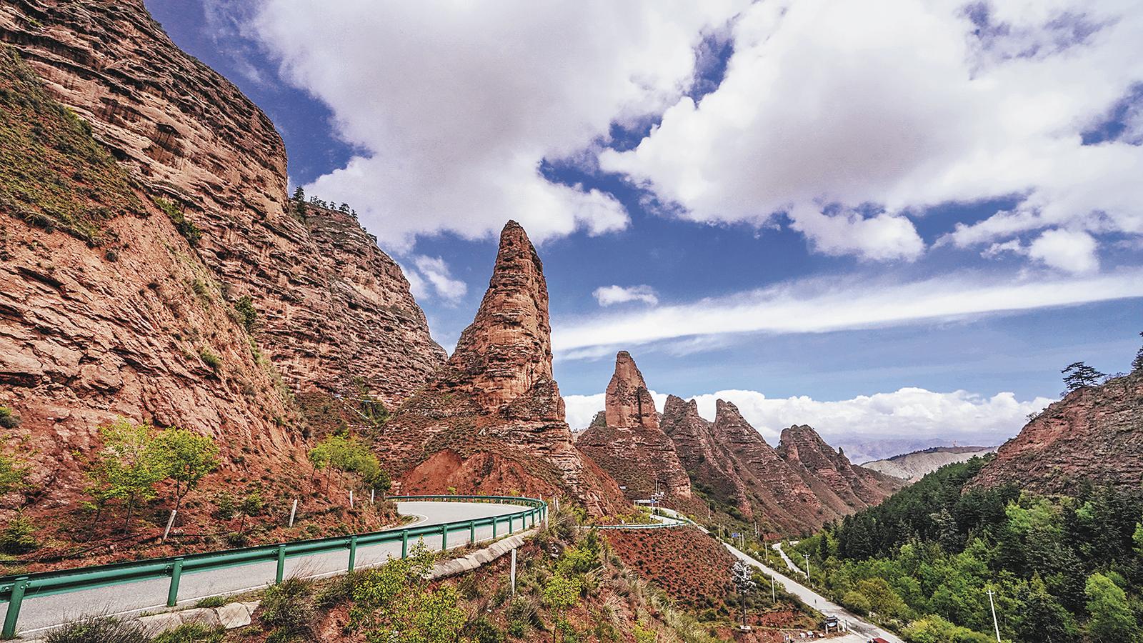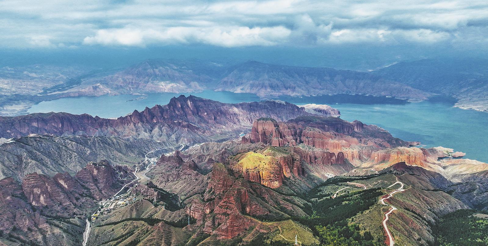 春風(fēng)輕拂,赤紅山脊在晨光中熠熠生輝,丹霞地貌的溝壑間仿佛鑲嵌著點點碎金。黃河在丹霞群峰間蜿蜒流淌,如一條翡翠綢帶。高原云杉在崖縫間挺立,枝頭簇?fù)?,迎接晨曦?/p>
