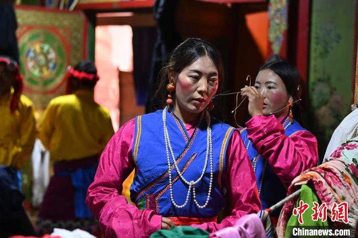 圖為演出人員在后臺整理服飾準(zhǔn)備上臺。中新社記者 九美旦增 攝
