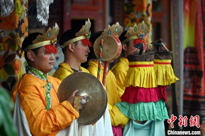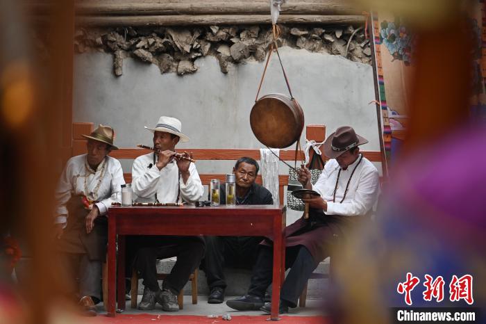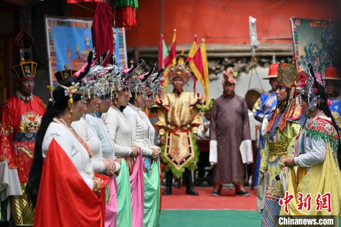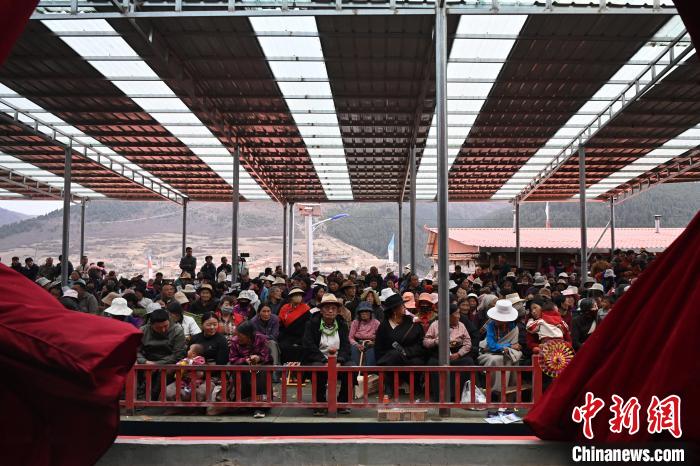5月7日,在甘肅甘南藏族自治州碌曲縣雙岔鎮(zhèn)二地村,當(dāng)?shù)卮迕裱堇[傳統(tǒng)八大藏戲之一的 《諾桑王子》 。中新社記者 九美旦增 攝