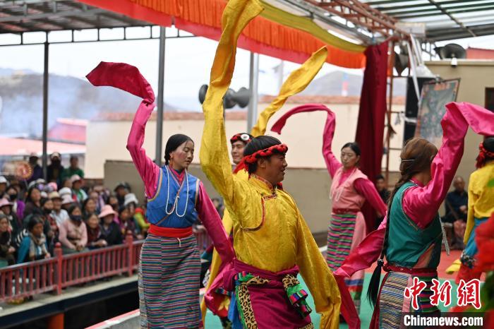 甘肅省甘南藏族自治州碌曲縣雙岔鎮(zhèn)二地村村口,近百輛摩托車、三輪車、汽車沿路有序停放,遠處嘹亮的藏戲歌聲傳入耳中。連日來,當?shù)匾荒暌欢葹槠谒奶斓哪夏咎夭貞蛘寡莼馃徇M行,吸引周邊村民、游客紛至沓來。