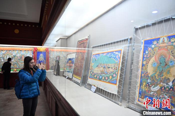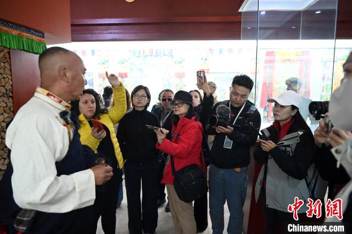 6月10日,甘肅甘南藏族自治州夏河縣,中外嘉賓參觀當(dāng)?shù)靥瓶ㄕ桂^。中新社記者 九美旦增 攝