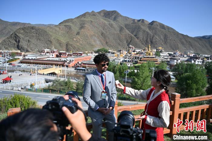 6月10日,甘肅甘南藏族自治州夏河縣,中外嘉賓參觀拍攝當(dāng)?shù)靥瓶ㄕ桂^。中新社記者 九美旦增 攝