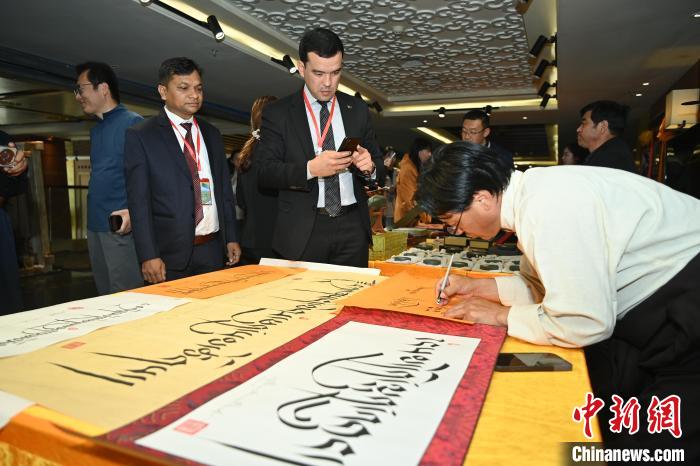 6月10日,甘肅甘南藏族自治州合作市,2025甘南文旅全球媒體發(fā)布會現(xiàn)場的藏文書法吸引中外嘉賓。中新社記者 九美旦增 攝