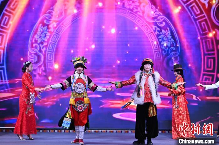 6月10日,甘肅甘南藏族自治州合作市,2025甘南文旅全球媒體發(fā)布會現(xiàn)場的民族服飾秀。中新社記者 九美旦增 攝