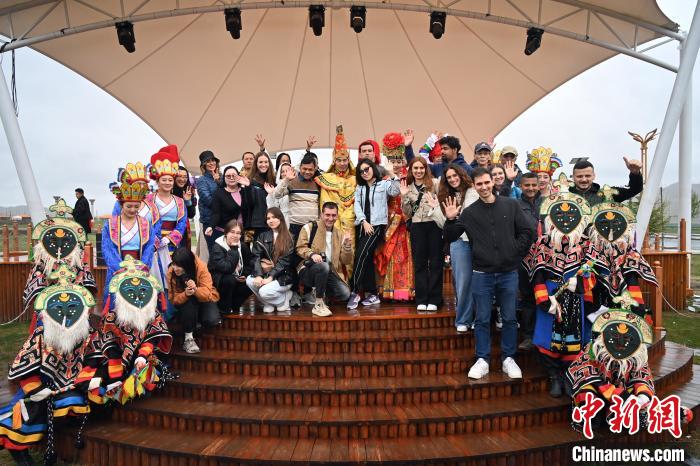 6月9日,甘肅甘南藏族自治州夏河縣,中外嘉賓與當(dāng)?shù)孛褡逦璧副硌菡吆嫌傲裟?。中新社記?九美旦增 攝
