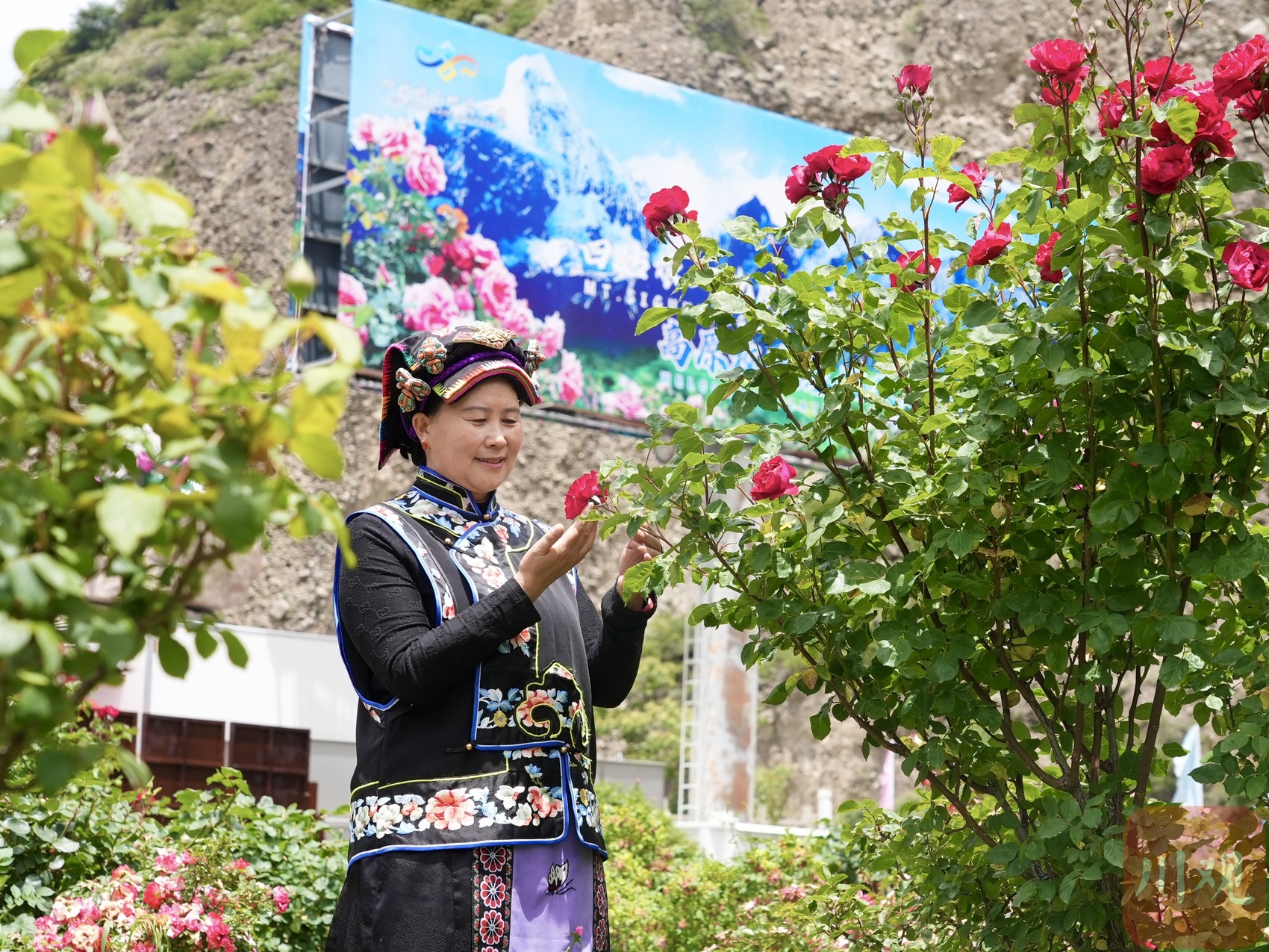 小金縣達維鎮(zhèn)冒水村黨支部書記陳望慧在玫瑰生產(chǎn)基地內欣賞玫瑰花。