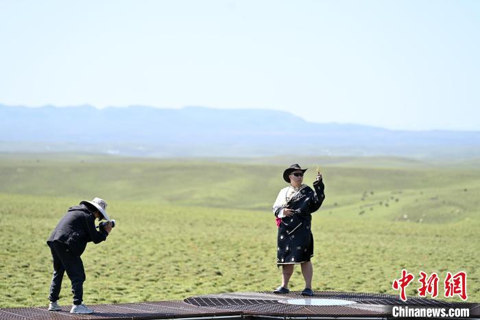 圖為在美仁大草原觀景臺(tái)上,游客體驗(yàn)藏裝拍攝。九美旦增 攝