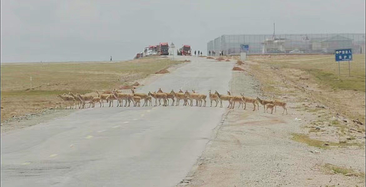 五道梁第一批回遷的藏羚羊穿過青藏公路。可可西里管理處供圖