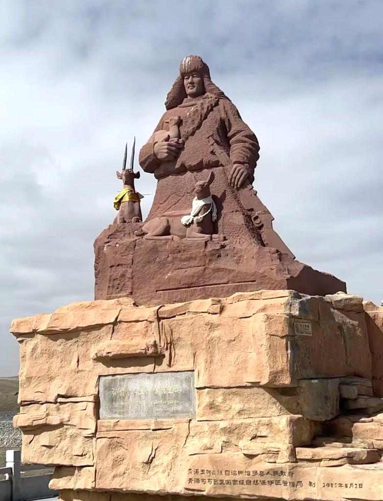 昆侖山口,索南達(dá)杰紀(jì)念碑靜靜矗立。紀(jì)念碑旁砂紅色的雕像,高大而肅穆。我們下車,向這位因守護(hù)可可西里藏羚羊而犧牲的英雄鞠躬致敬。