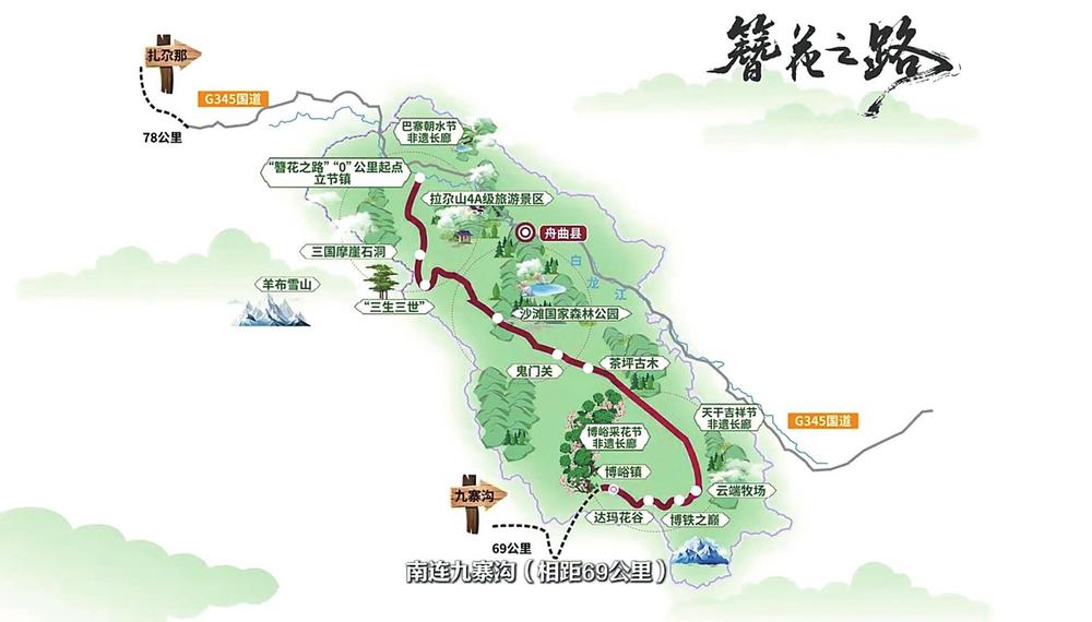 在甘川交界的崇山峻嶺間,有一條137公里的秀美公路,它北挽舟曲縣拉尕山的蒼茫林海,南牽四川九寨溝的瑰麗山水,像一根被晨露浸潤(rùn)的銀線,將舟曲縣境內(nèi)21座古老藏寨、8處生態(tài)秘境、3條非遺長(zhǎng)廊密密串聯(lián)——這串綴滿自然與人文瑰寶的“項(xiàng)鏈”,便是“簪花之路”。