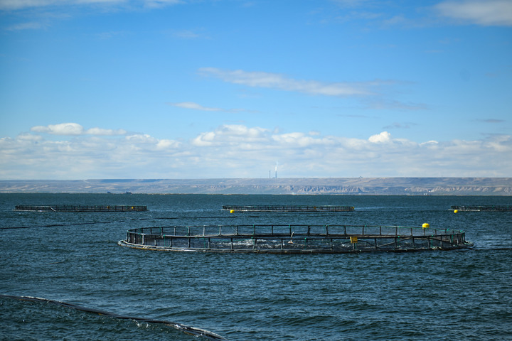 從空中俯瞰,龍羊峽水庫平湖區(qū)的水面上,數(shù)個大大的圓圈整齊排開,這些都是三文魚的養(yǎng)殖網(wǎng)箱。養(yǎng)殖網(wǎng)箱里,不時有魚兒躍起。順著管道,一條條三文魚隨著水流被吸魚泵直接從養(yǎng)殖網(wǎng)箱吸入操作車間。