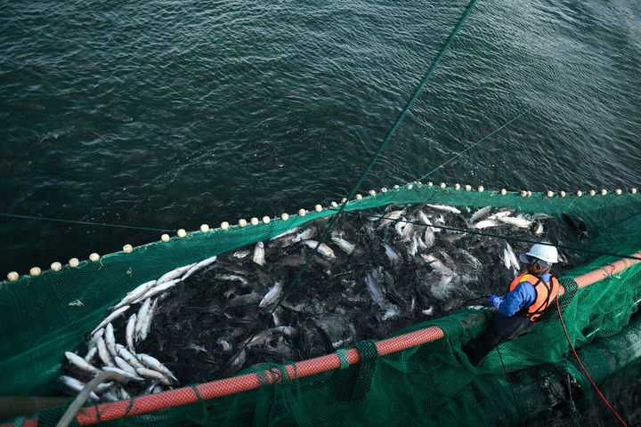 51歲的馮庭貴住在青海省海南藏族自治州共和縣龍羊峽鎮(zhèn),是龍洋知鮮(青海)股份有限公司捕撈隊隊長?!皞鹘y(tǒng)吊網(wǎng)捕撈會讓虹鱒魚產(chǎn)生更多肌酸,讓虹鱒魚的口感大打折扣。我們現(xiàn)在用吸魚泵連魚帶水直接送入車間,保證了魚的肉質(zhì)鮮嫩?!瘪T庭貴說。